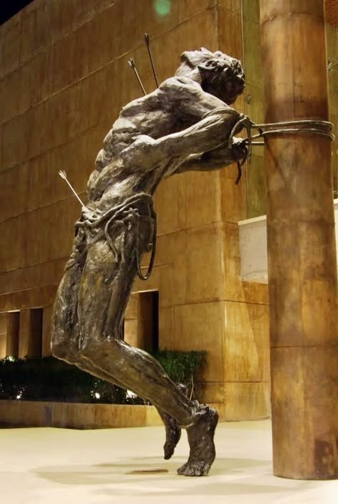 Coming up on my Pinterest mail several times recently, this powerful sculpture (with no identification beyond its mislabeling as a piece of classical sculpture), clearly of Saint Sebastian (in some public place; I’ve deleted a trash can in the background), tied to a figurative tree, mortally wounded by arrows, his body contorted in unbearable pain, writhing in the deepest agony, with no trace of homoerotic ecstasy: