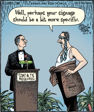 … In the cartoon above, the sign says COAT & TIE REQUIRED, leaving it to those who view it to understand that a coat and tie are required in this particular context, which is that of a formal restaurant (to know that this is in fact a formal restaurant, you need to recognize the figure of the snooty maître d’), and that the requirement is confined to this context. And that the requirement applies only to people asking to be seated to eat in the dining room; it wouldn’t apply to someone merely standing by the entrance or to a photographer allowed to come in to take pictures of certain diners. And that the requirement applies only to men, even though some women, like Marlene Dietrich, are fabulous in a coat and tie
