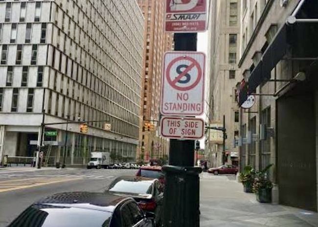 And then there are contextual issues: who does the sign apply to, and where is the sign in force? The regulatory traffic sign NO STANDING must be understood as applying to vehicles, not pedestrians; and there might be some question as to the area covered by its prohibition. As there was in Detroit in 2018; from the Deadline Detroit site on 9/27/18 in “Update: City Installs ‘No Standing’ Sign In Response To Deadline Detroit Column”: