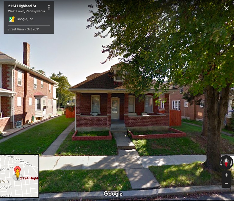 (#2) 714 N. Wyomissing Blvd. as it is now, not much changed from a hundred years ago — 4 bedrooms, 1½ baths; when my grandfather retired from TMW, my aunt Lillian and her husband Al Coleman took this house; my grandfather then bought the West Lawn house (in #3 below) and passed it on to my father, as my parents were moving back to the Reading area from Allentown, and he then bought a small farm in Sinking Spring (the next town west of West Lawn), which had what I thought of, for all of my childhood, as my grandparents’ house — until, eventually, my grandmother died, the farm got to be too much for my grandfather to handle, and he moved back into 714 N. Wyomissing Blvd., where, around my age now, he descended into dementia, under my Aunt Lillian’s care, until he died there