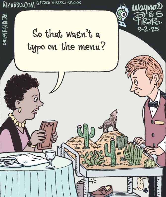 In yesterday’s Bizarro strip, Wayno brings us a restaurant that offers a genuine desert — désert — menu, featuring triumphs of food in Sonoran miniature (the howling coyote is a masterpiece of sculpture in mackerel skin, and the cornichon saguaros make a piquant contrast in texture and flavor):