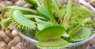 (#2) The hungry leaves; these are generally rusty-colored on the inside, but here are green (the one on the left has closed on a snared fly)Although various modern hybrids have been created in cultivation, D. muscipula is the only species of the monotypic genus Dionaea. It is closely related to the waterwheel plant (Aldrovanda vesiculosa) and the cosmopolitan sundews (Drosera), all of which belong to the family Droseraceae. Dionaea catches its prey — chiefly insects and arachnids — with a “jaw”-like clamping structure, which is formed by the terminal portion of each of the plant’s leaves; when an insect makes contact with the open leaves, vibrations from the prey’s movements ultimately trigger the “jaws” to shut via tiny hairs (called “trigger hairs” or “sensitive hairs”) on their inner surfaces.