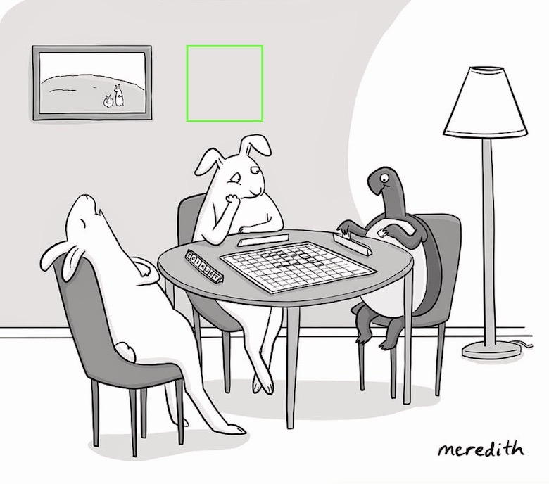 (#2) Two hares playing Scrabble with a tortoise are overcome by ennui