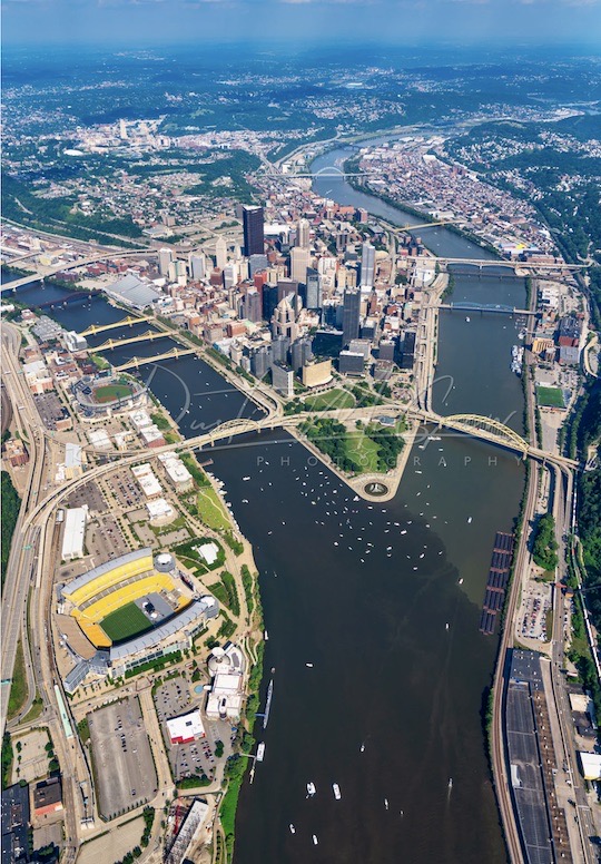 Where the Allegheny (in the northeast) and the Monongahela (in the southeast) meet to form the Ohio, which flows west into Ohio (the Dustin McGrew Photography aerial photo has been rotated to give a more dramatic view)