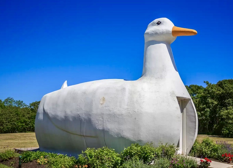 An orange-yellow beak juts out unassumingly over Flanders Road [in Southampton] on Long Island. … The Big Duck … has been amusing passing motorists for almost a century. The historic roadside attraction is a symbol of postmodern architecture and a throwback to a time when marketing was a bit more whimsical.