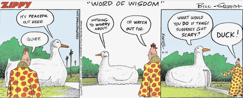 Today’s (4/14) Zippy strip has our Pinhead in conversation with a giant cement duck:
