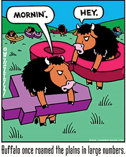 That’s numbers (roughly ‘amount’, but as a PL C noun) — and indeed large numbers of buffalo did once roam the plains of North America — vs. numbers referring to physical models, or simulacra, of symbols for certain abstract mathematical entities — in this case, the natural numbers. Such physical models are also familiar: think of the letters in the HOLLYWOOD sign, or the numbers on the building at 666 Fifth Ave. in NYC (with its own kind of fame as a Jared Kushner property). But people don’t walk around with, much less inside, giant versions of such models. That’s deliciously absurd.