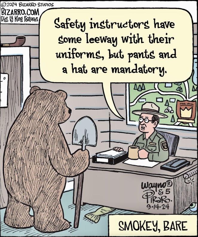 September 14, 2024Today’s Wayno / Piraro Bizarro — Wayno’s title: “Forestry Union Negotiations” — plays with the homophones bear and bare in a fresh way, turning on the fact that Smokey the Bear (in those American public service ads for fire safety) is in fact a National Park Service ranger (who happens also to be a talking bear), and so would be required to dress in ranger garb: