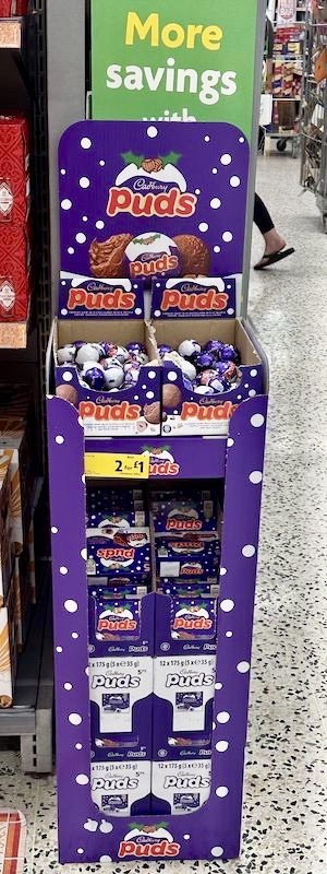 Providing us with this store display for Christmas versions of Cadbury’s Puds: