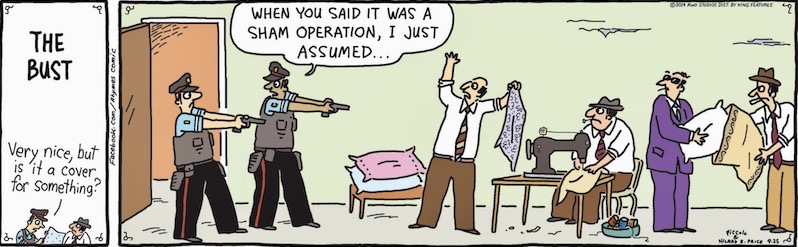 (#1) sham conveying fraud, hence illegality; vs. sham for a decorative pillow cover (being manufactured in a small workshop, though note the suggestion in the title panel that the place might be a cover — ambiguity alert! — in the sense ‘an activity or organization used as a means of concealing an illegal or secret activity’ (NOAD) — but why are these pillow coverings called shams?