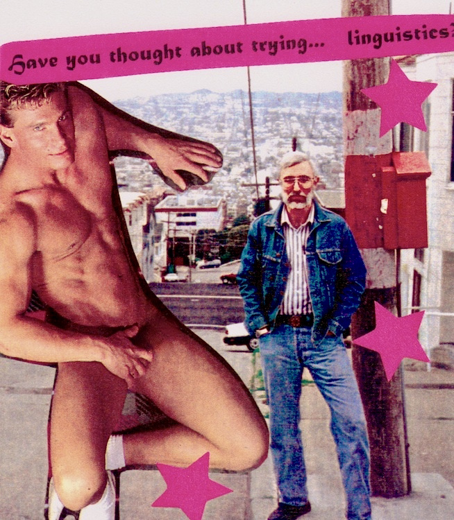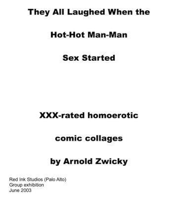 And on almost every available vertical surface, artworks, cartoons, collages, Zwicky images, postcards (men, animals, food, whatever), and photographs, both family photographs and hot guys. In the heavily X-rated bedroom, a huge assortment of my XXX-rated homoerotic comic collages.