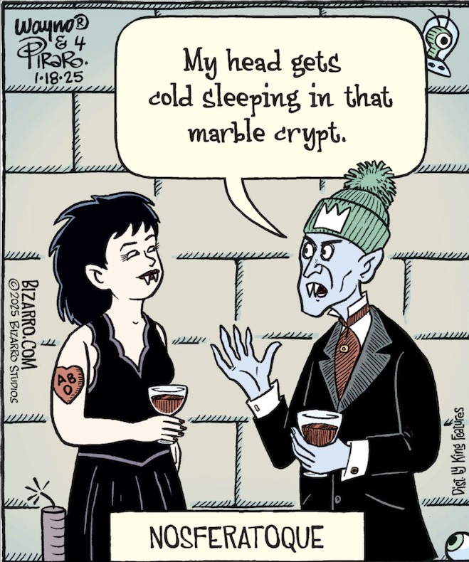 The male nosferatu (holding a wineglass of what is presumably blood, and chatting with his young female companion at some sort of vampiric meet-and-greet) seems to be wearing a Canadian toque (= tuque), with pom-pom, to warm his head during the cold dark nights in his coffin (yes, it’s very silly) (if you’re puzzled by the odd symbols in the cartoon — Wayno says there are 4 in this strip — see this Page)