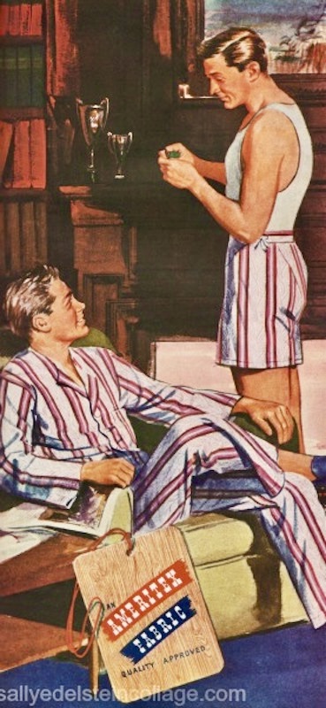 (#1) A 1944 ad for Wilson Wear pajamas and shorts; SE’s comment: Boxers, bedrooms and pajamas were a natural setting for a romp among “roomates”