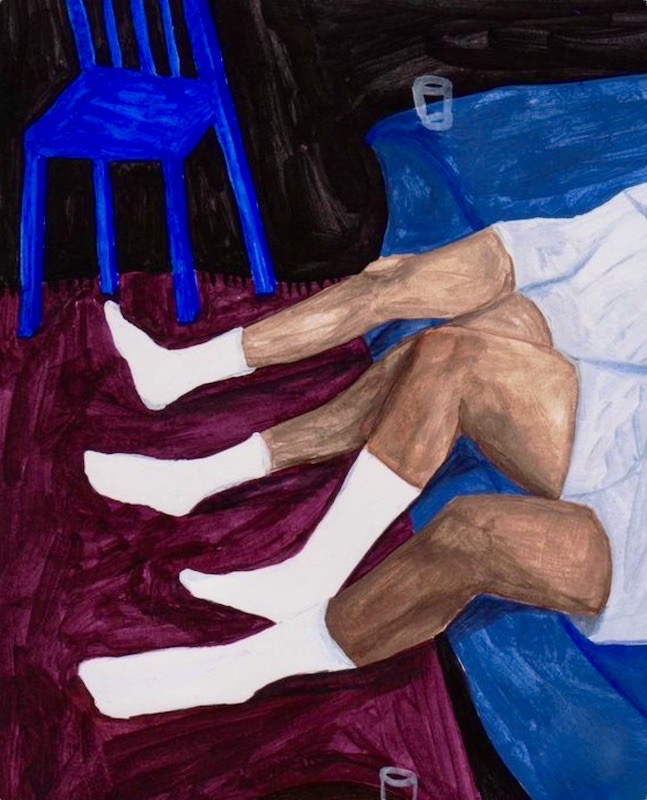 (#1) White Sock Club: one in a series with two boys, in white socks, on a blue sofa — a place where much can happen, but isn’t shown, only implied