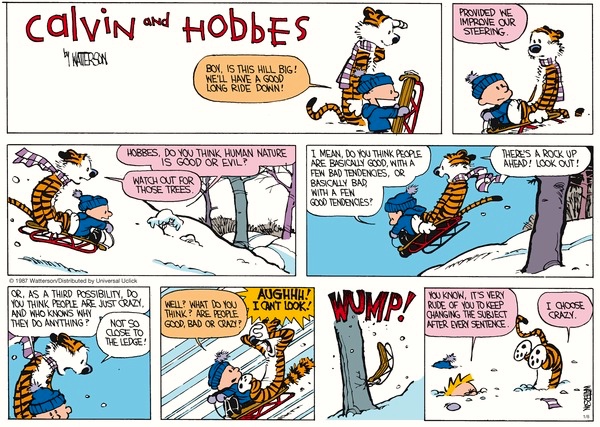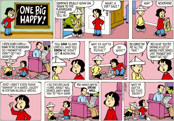 Two comics in yesterday’s feed: an old Calvin and Hobbes (about staying on topic) and a recent One Big Happy (with Ruthie once again correcting a kid’s English — for his own good, of course):