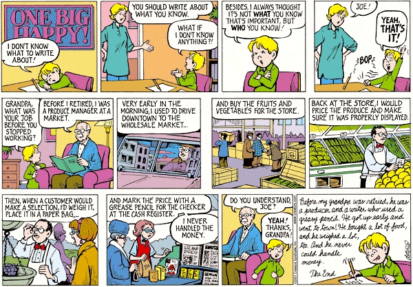 For Daylight Saving(s) Time in the U.S., three cartoons having something to do with discourse organization: One Big Happy, Bizarro, and Dilbert: