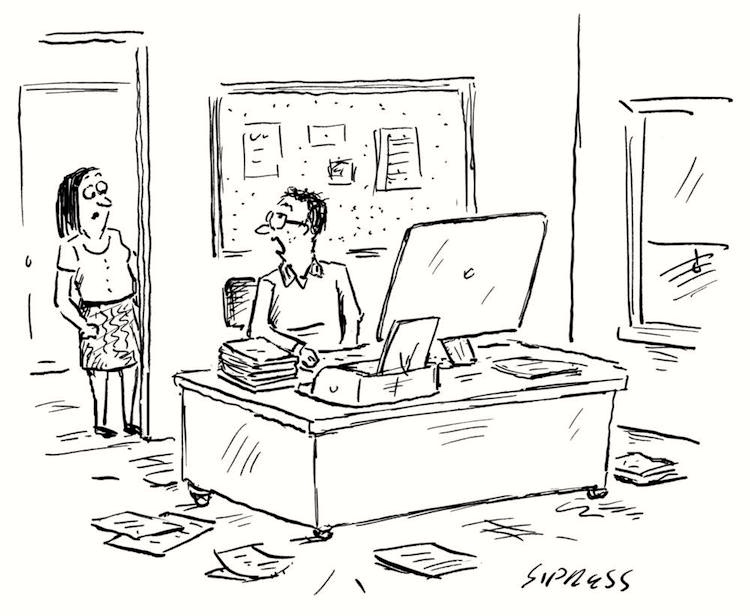 The title To Kill a Mockingbird –> To Mock a Killingbird by transposition (exchange, reversal), of kill and mock (the sort of exchange seen in Spoonerisms as inadvertent errors). Formally of interest because the process “goes into” a compound word, to affect one of its parts (mocking), and also into an affixed word, to affect its base (mock). On the conceptual side, this particular kind of wordplay is shallow, thin, since only one of the two paired situations is represented in the cartoon: having served its purpose as base for transposition, the book To Kill a Mockingbird plays no further role in the proceedings.