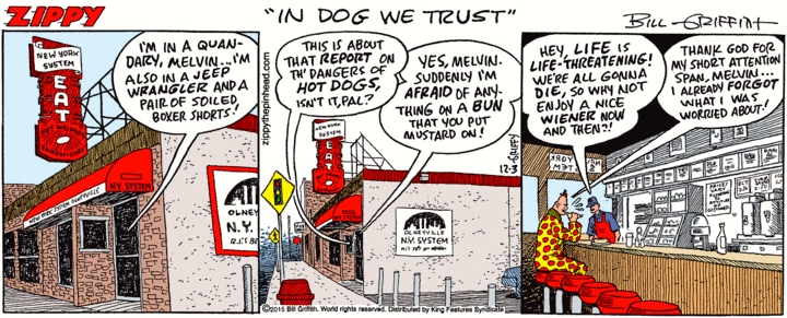 [1] and [2] catch your attention because they’re somehow jokey, some kind of play on words. The two parallel underlined stretches are word-for-word identical, but they’re not parallel in meaning, and we expect them to be. This semantic disparity makes [1] and [2] examples of what I’ve called zeugmoids. More on all that to come, but first I want to make the phenomenon clearer.