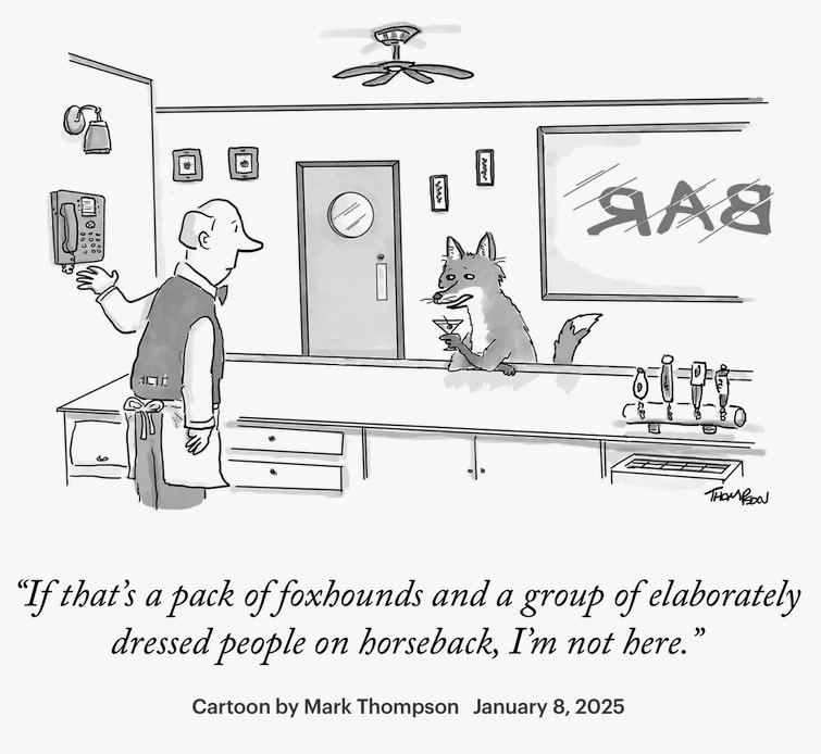 A Mark Thompson cartoon in the 1/20/25 issue of the New Yorker offers a foxy goulash of cultural forms: cartoon memes, joke forms, story formats, and conversational routines: