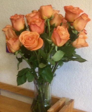 September 7, 2025Sharon Gray of Bay Area Geriatric Care turned up yesterday with a surprise present for my 85th birthday: a big vase of orange roses (on the pinkish or peach side of the color), because those were the really big and beautiful roses she could find on the spur of the moment, without assigning any meaning to the color (though I’m a Princeton A.B., rah rah orange and black and all that), and indeed not knowing what the particular variety was named (you wouldn’t believe how many rose-growing companies there are in the world and what an encyclopedia of names they have registered for orange cultivars). Now located right in my line of sight as I type at my worktable: