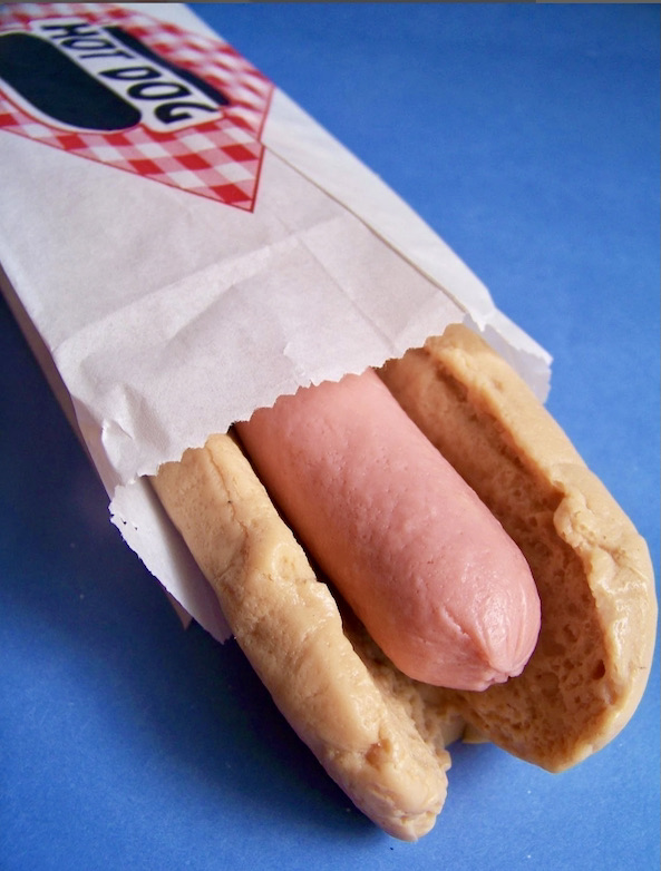 (#1) A (phallic) simulacrum of a phallic symbol (starting with the hot dog as symbolic penis) — but intended not for ordinary cleansing purposes (though entirely usable this way), but as a practical joke, a prank, turning on the meticulous realistic detail in the simulacrum