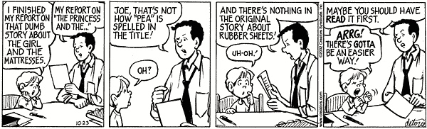 The assigned story was “The Princess and the Pea”, but Joe had heard only the title (and a bit of the plot), so /pi/ could have been the letter P, or (bizarrely) the vegetable pea, or (given the mention of mattresses) urine, pee. Joe goes with what he knows, and, having not actually read the story, confabulates a tale of enuresis.