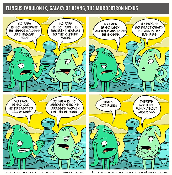mixing fact with fiction. Scott wants his barbs to be believable, but he often uses exaggerations, or lies disguised as truth, for maximum effect.