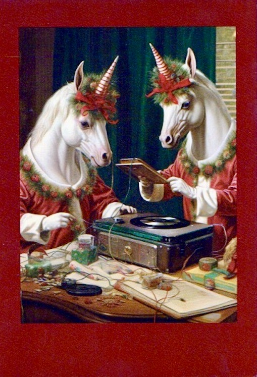 December 14, 2023… decked out in red and green, in lovely Christmas smocks; also throughly wired and wielding gear, both vintage (what appears to be a record player) and modern (iStuff), along with Christmas gift boxes: