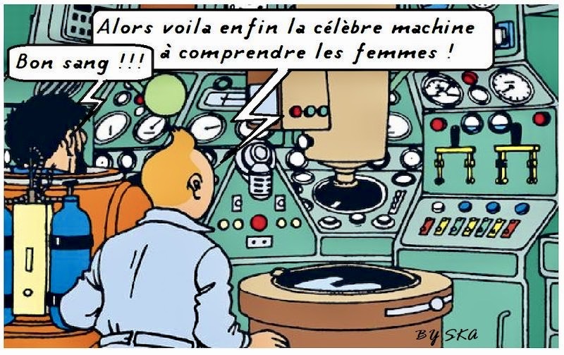 From Joelle Stepien Bailard on Facebook yesterday, this Tintin panel (whose specific source I do not know), in which Tintin and Capt. Haddock finally reach the famous machine for understanding women: