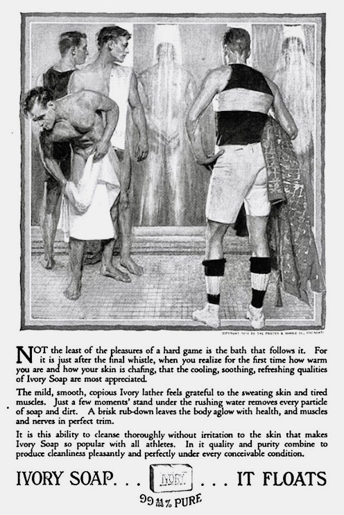 A JCL ad for Ivory Soap, set in an athletic homosocial space, the locker room showers (note the male buttocks, a recurrent object of JCL’s artistic — and presumably also personal — engagement).