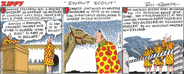 Zippy strips also burlesque poetry — for instance, an assortment of poets slammed here (“I calibrate my elf”!) and Ginsberg’s Howl riffed on here.