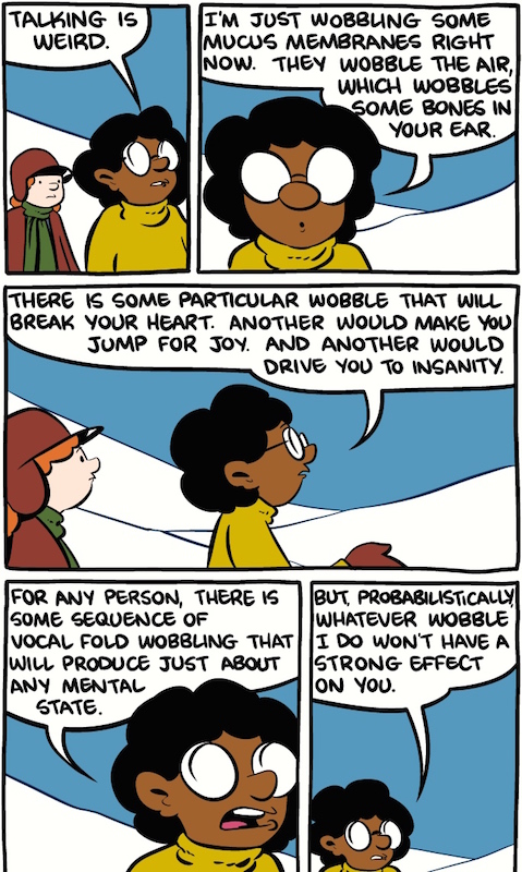 The strip shows the origin of language in male humans substantially lagging that in females, as if the sexes were different species — a preposterous idea when you examine it with any care. But the strip plays on a real phenomenon, that the acquisition of language in boys tends to lag somewhat behind that in girls. Boys speak later, and less, than girls, common wisdom has it. Well, common wisdom isn’t exactly wrong, but it treats, inaccurately, what is in fact a small statistical difference between the sexes (which largely overlap with one another) as an absolute gap.