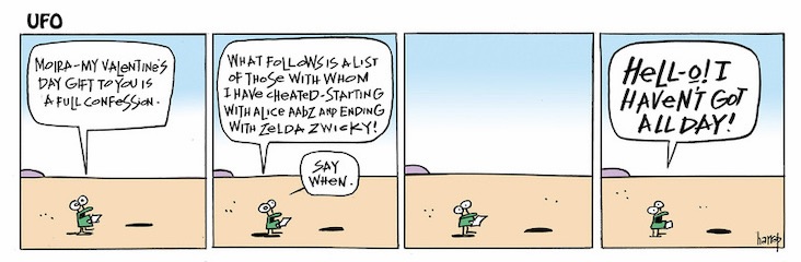 Mitch Marks has sent me a comic strip appropriate for the day (which drips with sex) and personally meaningful to me (it has a Zwicky in it, though only for alphabetical purposes): the 2/13 strip in Graham Harrop’s comic UFO, in which a character I’ll call John (for Don Juan / Don Giovanni) prepares to catalogue his infidelities, not by country as in the Mozart / Da Ponte opera (but in Spain there are already a thousand and three), but by letter of the alphabet, from Alice Aabz to Zelda Zwicky: