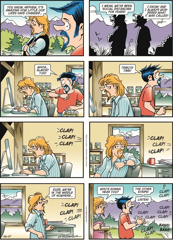 Annals of pandemic vocabulary: the N + N compound tribute time ‘a time (moment in a day) for tribute’, specialized for a specific form of tribute (largely, clapping) to a specific group of tributees (medical workers). The practice has been around for several months, but the label seems to have emerged more recently (I don’t have the resources to track these things down), and now it figures in today’s wry Doonesbury cartoon, about Zonker Harris and his nephew Zipper: