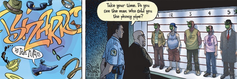 A Sunday Dan Piraro Bizarro, a little René Magritte festival that doesn’t actually mention the Belgian surrealist, but just assumes everyone recognizes the three paintings the cartoon alludes to: