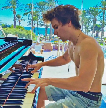 A shirtless young man in ripped denim shorts playing the 3rd movement of Beethoven’s “Moonlight” Sonata (Piano Sonata No. 14 in C-sharp minor, Op. 27 No.2) on a fancy grand piano (with a mirrored fallboard, as in the finest piano lounges). alongside the pool at at what looks like a tropical oceanside resort. (For a bit of extra sexiness, those shorts are down far enough in the back to expose the waistband of his black Calvins; here the girls and the gay boys swoon.)