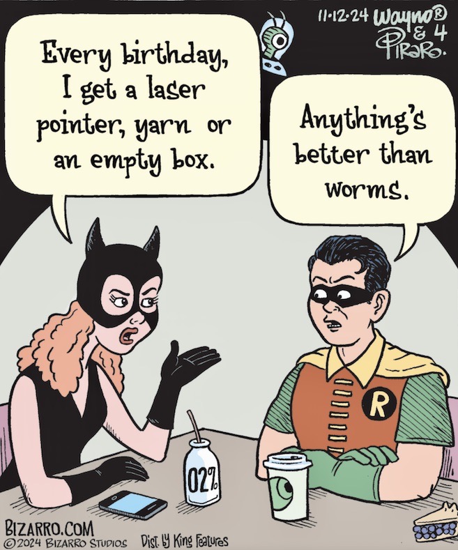 The Bizarro of 11/11, about birthday presents in Batworld: Selina Kaye (in her alter ego as Catwoman, where she is both woman and cat) and Dick Grayson (in his alter ego as Robin, where he’s a boy named Robin, and not a bird) grouse about the presents they receive — probably from Bruce Wayne (in his alter ego as Batman) — by virtue of their creature-name aliases: