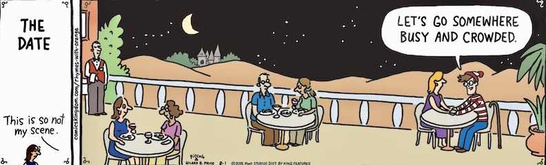 Today’s (Piccolo & Price) Rhymes With Orange strip depends on the viewer identifying the main character, the one who says he wants to go someplace busy and crowded, as a pop-cultural figure known for losing himself in crowds: