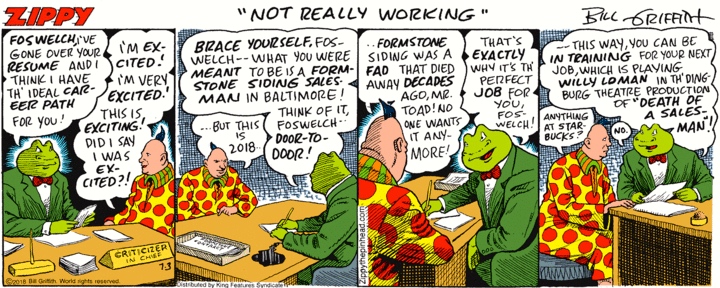Today’s Zippy has Mr. the Toad recruiting a Pinhead named Foswelch — Toad uses the name as an address term in every panel of the strip except the last — as a Formstone siding salesman in Baltimore: