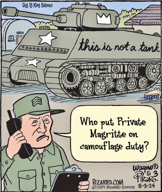 August 3, 2024It’s been a while since we contemplated a Magrittean disavowal, in the tradition of the Belgian surrealist’s paradoxical Ceci n’est pas une pipe, so today’s absurd Wayno / Piraro Bizarro strip is a welcome addition to the genre:
