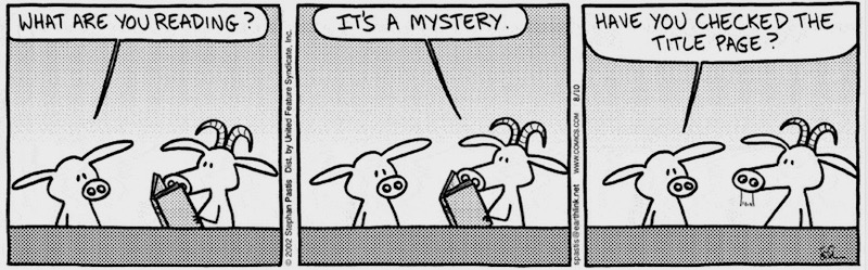 Very much a MQoS Not Dead Yet posting, as I’m barely functioning after one of those stunning drops in air pressure. Hanging around on my desktop for just just an occasion, this mystery-pun Pearls Before Swine cartoon from 2002 featuring Pig and Goat: