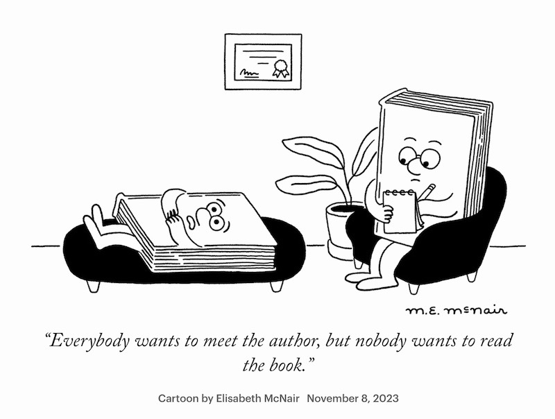 The new issue of the New Yorker (dated 11/20/23) brings us a Psychiatrist cartoon by Elisabeth McNair, one of a special subtype I’ll call In-Group Psychiatrist (in which a patient from some extraordinary group — a dog, a robot, a squid, what have you, in #1 a book — is being treated by a therapist from that very group):
