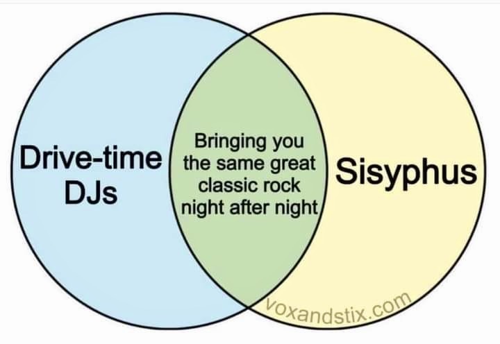 ☀️ 🌑 for Solar Eclipse Day, Sisyphus and drive-time DJs intersect in a Venn diagram, where they generate a wonderful even-handed pun: