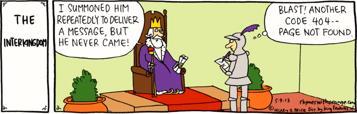 A pun of a type that juxtaposes two strikingly different contexts (here, court life in a monarchy, on the one hand, and the internet, on the other) in such a way that two different senses of an expression are both applicable.