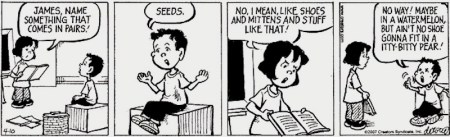 A very much not-dead-yet posting to hold this space while I cope with an avalanche of posting material, plus my suddenly much improved medical condition (which is totally exhilarating). In any case, an old One Big Happy cartoon (originally from 9/4/14) in which Ruthie asks her defiantly working-class neighbor James to name something that comes in pairs, but James hears the homophone pears (both nouns pronounced /perz/ in my variety of English) and just can’t get shift his perspective: