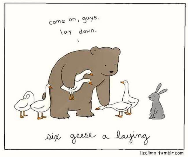 Liz Climo’s cartoon for today, 12/30, the 6th day of Christmas (“Six geese a-laying” — that is, laying eggs):