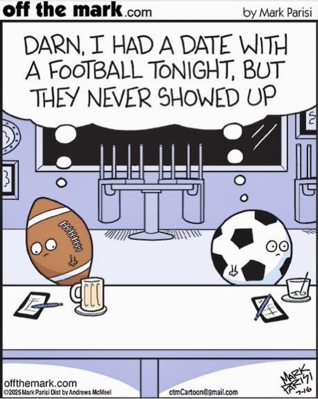 Very briefly (it’s been a hellish day). In my comics feed for today, penultimate July, Mark Parisi’s off the mark cartoon of 7/16/25, in which an AmE football and a BrE football fail to hook up with a sportsball of their own kind — next to one another in a bar.
