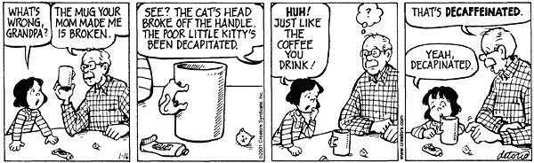 Today also brought a Facebook posting from my friend Mary Ballard, to whom the whole inaugural-rabbit thing was news, and, by good fortune, three cartoons from various sources: a Bizarro I’ve already posted about; a Mother Goose and Grimm with an outrageous bit of language play; and a Calvin and Hobbes reflection on the meaning of the verb read.