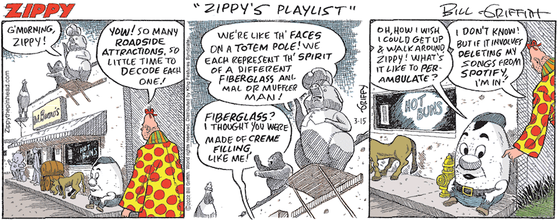 March 15, 2022Today’s Zippy strip takes us to the near suburbs of Philadelphia, on the New Jersey side of the Delaware River, to Del Buono’s Bakery (and Carmen’s Deli) in Haddon Heights (Camden County) — a serious commercial bakery whose store is home to a large family of fiberglass creatures, roadside icons goofily congregated around the bakery building: