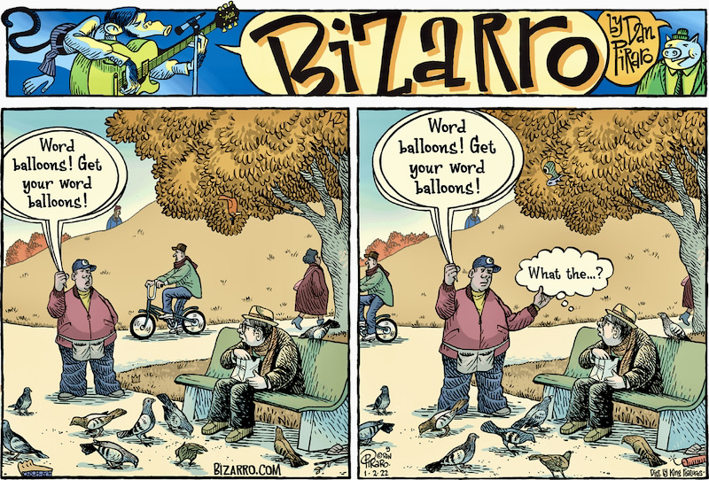 In today’s (1/2/22) Bizarro, the Old Balloon Peddler hawks his wares in the park: